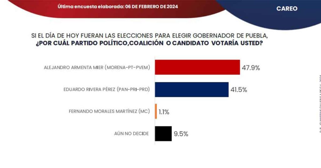 En su última entrega, detallaron que Armenta Mier tiene el 47.9 de la intención del voto, mientras que, el precandidato del PAN, PRI y PRD, Eduardo Rivera obtuvo un 41.5%.