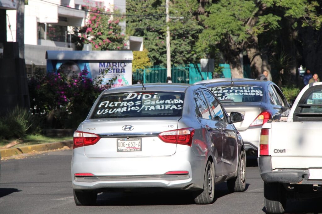 Conductores trabajadores de las empresas DIDI y UBER se manifestaron en las inmediaciones de las oficinas de dichas plataformas de servicio de transporte para exigir transparencia en sus tarifas, seguridad, actualizaciones en la aplicación entre otras cosas para el beneficio de los usuarios.