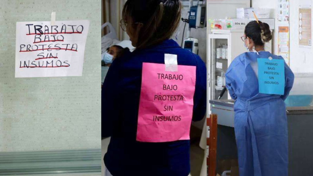 En días recientes se viralizaron imágenes de la protesta silenciosa dentro del hospital, donde médicos y enfermeras colocaron mensajes en sus batas denunciando la falta de material de curación y equipo básico. “Trabajo bajo protesta. Sin insumos” se hizo visible en áreas clínicas y pasillos del nosocomio.