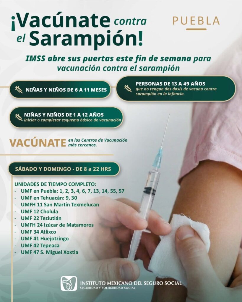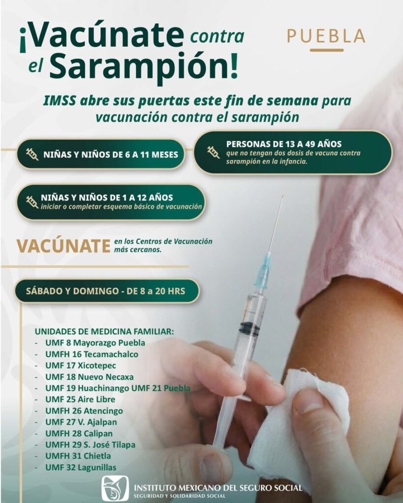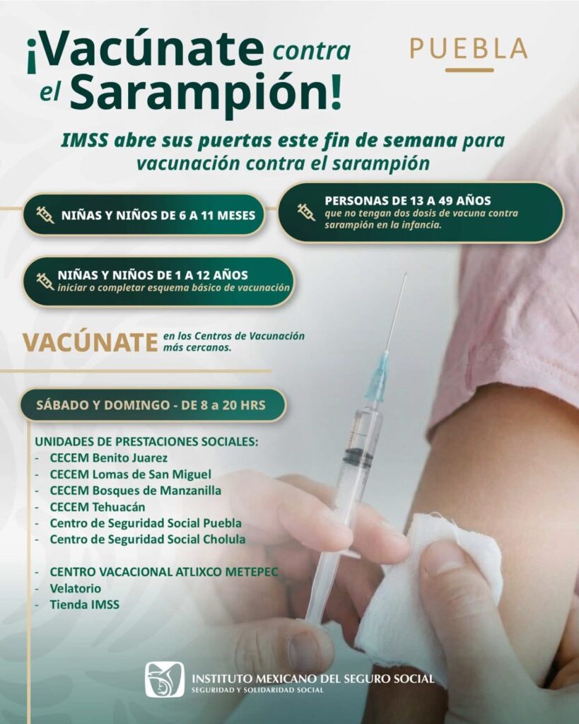 El Instituto mexicano de Seguro Social (IMSS) anunció la jornada de vacunación contra el sarampión en Puebla dirigida a derecho habientes y población en general