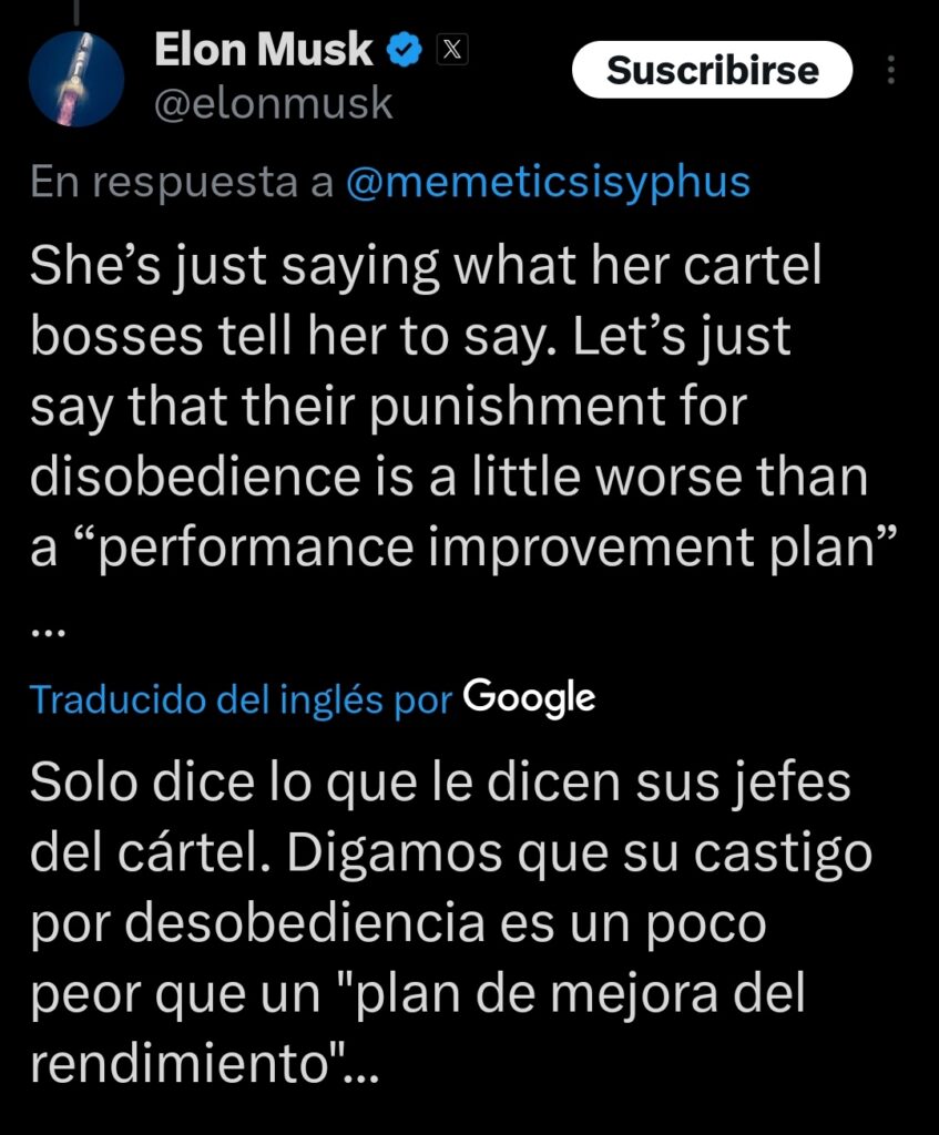 La presidenta de México, Claudia Sheinbaum, informó que considera emprender acciones legales tras las señalamientos del empresario Elon Musk: “ella solo dice lo que le dicen sus jefes del cártel”.